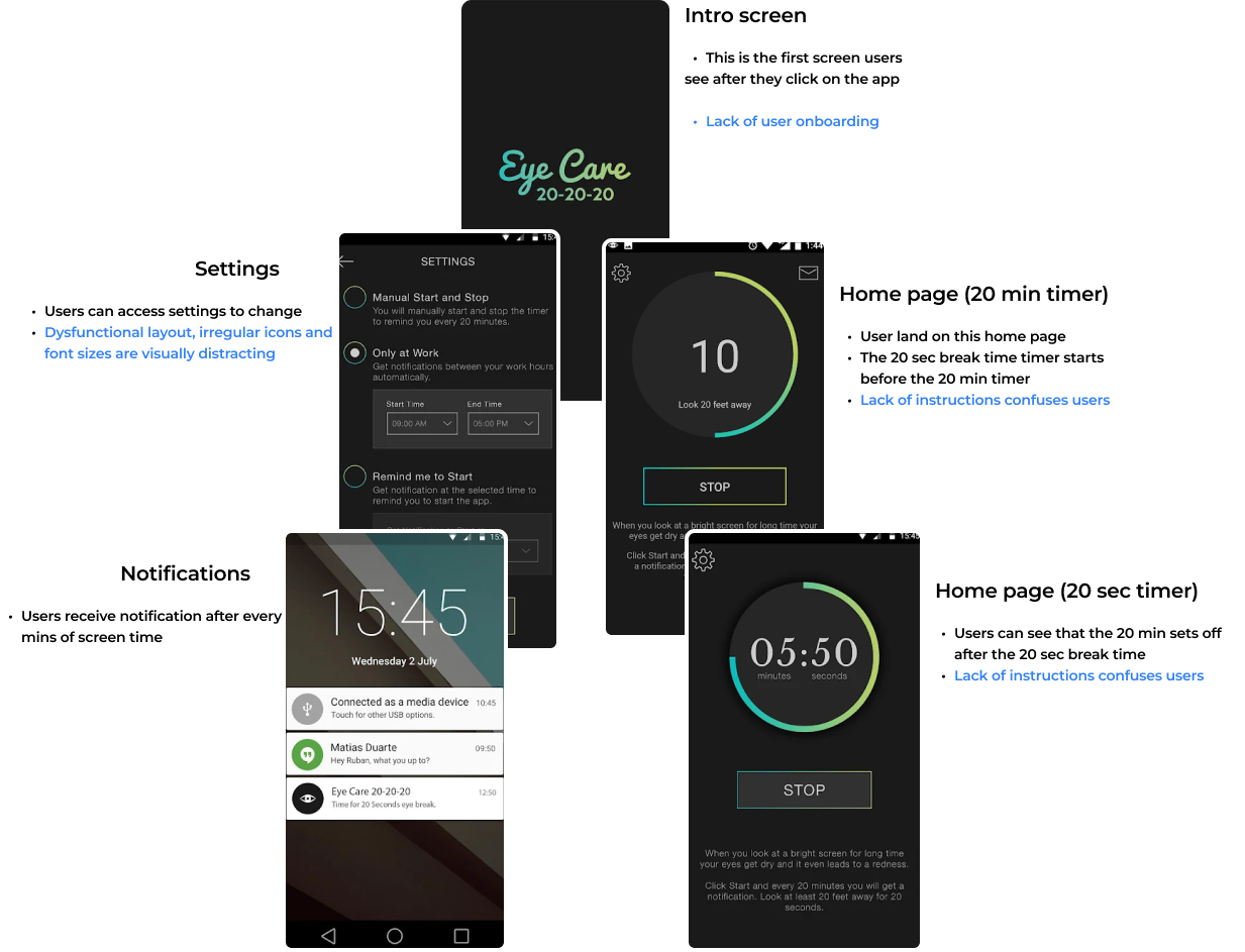 I conducted a quick secondary research to understand our relationship with digital screens. It helped me devise ideas to redesign the app, especially targeting the necessity of the app for avoiding eye health issues.